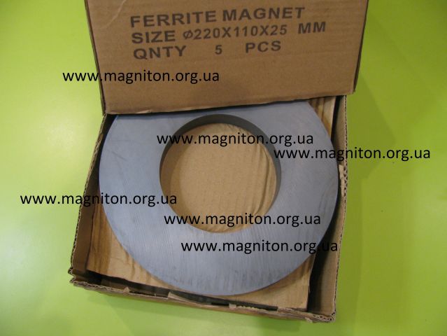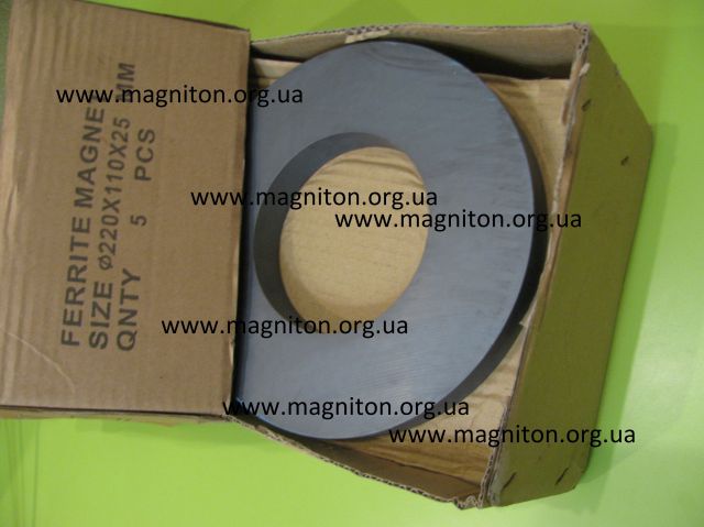 Ферритовый магнит, кольцо D220-d110xh25 mmВи можете збільшити зображеннямагніту, натиснув на нього Категорія: Ферритовые магниты Мощный ферритовый магнит кольцо, диаметр 22 см, внутренний диаметр 11 см, высота 2,5 см. Вес: 3,45кг.