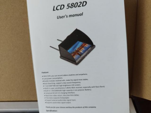 FPV монитор LCD 5802 D (7", 800x480, 40 кан., DVRВи можете збільшити зображеннямагніту, натиснув на нього Категорія: Товары для ЗСУ FPV монитор LCD5802D 5.8G 40CH DVR (FPV monitor LCD5802D 5.8G 40CH DVR) 7-ми дюймовий відеомонітор з вбудованим FPV 40 канальним приймачем діапазону 5.8ГГц і функцією запису вхідного відеосигналу в AVI форматі на карту пам'яті (ідеальне рішення для розборів польотів) і можливість відтворення записаних відео файлів. Простота використання, компактність, тривала робота від однієї зарядки акумулятора і гарна якість зображення - неповний перелік переваг даного дисплея. Вбудований акумулятор заряджається від блоку живлення (йде в комплекті з вилкою американського стандарту). Перемикання каналів виконується через вбудоване меню дисплея. Технічні характеристики: