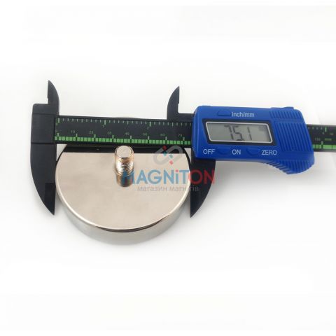 Держатель магнитный состоит из магнита, запрессованного в стальной корпус. В данных магнитных держателях используются неодимовые магнитные диски, имеющие два полюса расположенных по плоскостям (аксиальное намагничивание). Второй полюс, полностью утопленный в корпусе, также оказывает воздействие на видимый наружный полюс, усиливая его и увеличивая силу сцепления. Таким образом магнитные держатели в стальном корпусе характеризуются относительно высокой грузоподъемностью. Рабочий диапазон магнитного поля при этом снижается. В этом магнитном держателе используется неодимовый магнит . Максимальная рабочая температура для магнитных держателей с неодимовыми магнитами 80 ° [C] . Заданную максимальную грузоподъемность держателя измеряют в оптимальных условиях, то есть с помощью магнитной пластины из низкоуглеродистой стали (St3S), имеющей толщину не менее 10 [мм], с гладкой поверхностью при нулевой шерховатости, при отрыве от поверхности строго перпендикулярно, а также при комнатной температуре. Примечание: приведенная сила сцепления магнита имеет относительное значение. Фактическое сцепление магнитного держателя будет зависеть от следующих факторов: