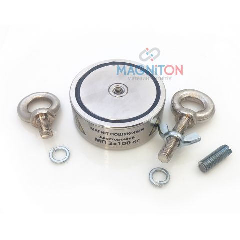 Магнит поисковый двухсторонний МП 2х100 кгВи можете збільшити зображеннямагніту, натиснув на нього Категорія: Магнит поисковый двухсторонний Тест силы сцепления 166 кг. Диаметр: 62 мм. Вес: 570 г. Магнит поисковый двухсторонний MP2*100 на 100 кг. Такой поисковый магнит используется при поднятии металлических предметов из скважин, воронок, из водоемов. Как магнитный держатель, для фиксации крупных предметов на металлическом потолке (балке), поднятии и переносе металлических деталей. Внутри каждого поискового магнита стоит неодимовый магнит в форме кольца. Корпус из металла надежно защищает неодимовый магнит ударов о железные предметы. Потеря естественных магнитных свойств поисковых неодимовых магнитов составляет 1-2% за 10 лет. Температура использования до 80ºС. Технические характеристики: