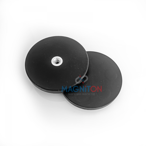 Магнитное крепление D66 мм проризиненоеВи можете збільшити зображеннямагніту, натиснув на нього Категорія: Магниты неодимовые крепежные в корпусе Круглый магнитный держатель c неодимовым магнитом в резиновом корпусе с резьбой под болт. Сила 12 кг. Вес: 88 г. Крупный магнитный держатель из оцинконанной стали с внутренней резьбой в резиновой оболочке. Сверху выполнена резьба М6, для вкручивания того, что будет держать магнит, а снизу вставленны неодимовые магниты, для удержания магнита на металлических поверхностях. Магнит имеет резиновую оболочку чорного цвета. Внешний диаметр (D) - 66 мм, резьба диаметром M6, высота изделия (H) - 8 мм. Весит крепление 88 грамм. Сила сцепления (на отрыв) около- 12 килограмм. Температура для работы (рекомендуемая) - до 80 °C. Пример использования - держатель антен, банеров на автомобиль. Технические характеристики: