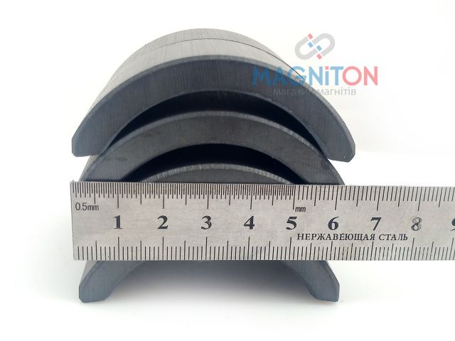 Набор 4 ферритовых сегмента СД 64х30х7мм (S+N)Ви можете збільшити зображеннямагніту, натиснув на нього Категорія: Магнит сегмент, магнит сектор Набор из 4 магнитов ферритовых в форме сегмента, наружным радиусом 35,6 мм, внутренним 28 мм и высотой 7,7 мм. Имеет радиальное намагничивание. Набор ферритовых магнитов сегментов размером СД 64х30х07мм с радиальным намагничиванием. Без покрытия. Дугообразный магнит сегмент, с северным (N) полюсом по внутреннему радиусу и южным полюсом (S) по внешнему радиусу. А так же противоположной полярностью - южным (S) полюсом по внутреннему радиусу и северным(N) полюсом по внешнему радиусу. Четыре таких сегмента образуют кольцо с внешним диаметром 71,2 мм и внутренним диаметром 56 мм.