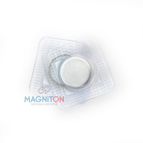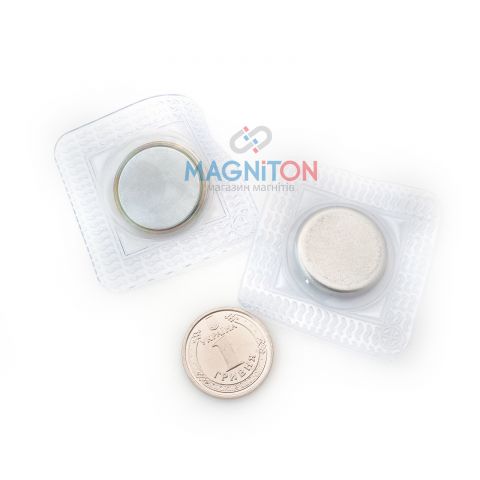 Вшивні неодимові магніти для одягу у металевому корпусі, розмір 20 на 1,5 мм у пакеті з ПВХ плівки. Плівка захищає магніт від зовнішнього середовища і допомагає тримати вшитий магніт у тканині. Металевий корпус магніта підсильює його і не дає магітам розколотися при ударах. Круглі вшивні магніти йдуть парами, які магнітяться один до одного. На ПВХ плівці є позначки "+" та "-" для магнітів з різною полярністю "S" та "N". Також магніти відрізняються за відтінком оцинкованого покриття, яке також зроблено для швачок, які мають вшивати магніти в одяг різними полярностями одна з однієї сторони, друга з іншої сторони клапана, кишені, куртки та т.і. Якщо допустити вшивання магнітів з однаковими полюсами, то магніти будуть відштовхуватись один від одного.