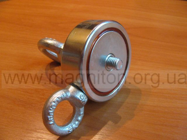 Больше не продается. Усовершенствованная модель поискового магнита F=120кг - имеет две открытые стороны магнита и два крепления рым-болта, что позволяет увеличить площадь поиска и найти больше находок. Такой поисковый магнит используется при поднятии металлических предметов из скважин, воронок, из водоемов. Как магнитный держатель, для фиксации крупных предметов на металлическом потолке (балке), поднятии и переносе металлических деталей. Технические характеристики: