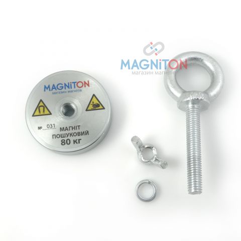 Данный поисковый магнит оборудован устройством механического отрыва. Устройством механического отрыва поискового магнита МП 80 кг служит рым-болт, который прокручивается сквозь магнит. Как это работает: прокручивая рым-болт сквозь корпус поискового магнита, он отделяется от поверхности металла и потом его можно оторвать без особых усилий. Комплектация: 1. Магнит в корпусе МП 80 кг. 2. Рым болт. 3. Контр-гайка. 5. Инструкция по эксплуатации поискового магнита, гарантия, сертификат испытаний.