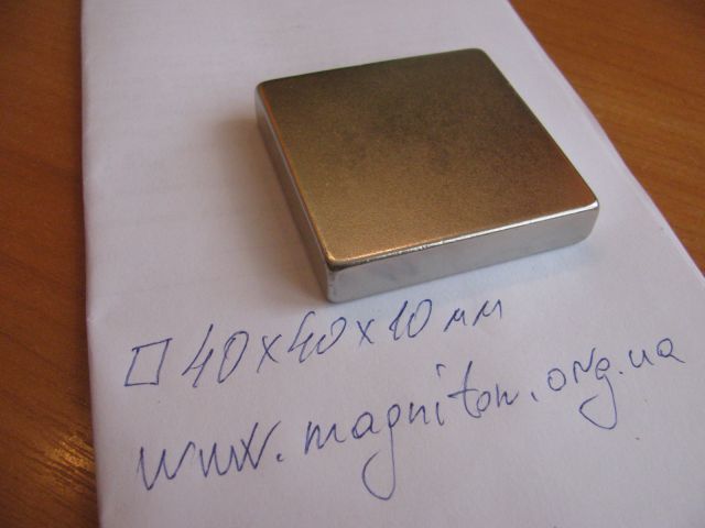 Супермагнит. Магнит 40х40х10 ммВи можете збільшити зображеннямагніту, натиснув на нього Категорія: Магниты прямоугольные Магніт квадрат зі сторонами 40 х 40 х 10 мм. Зчеплення приблизно 35 кг. Сплав Nd-Fe-B. N38.