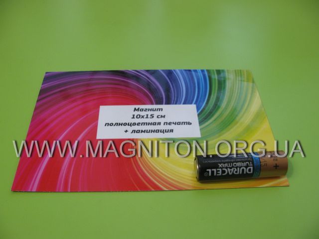 Виниловый магнит 100х150ммВи можете збільшити зображеннямагніту, натиснув на нього Категорія: Изготовление виниловых магнитов под заказ Описание Формат обфчной фотографии 10х15 см, можно приклеить фото на холодильник. Виниловые магниты 10х15 см и толщиной 0,45 мм изготавливаются из мягкого магнитного винила на высококачественном лазерном оборудовании (полноцветная печать) с ламинацией изображения. Изображение, которое Вы хотите видеть на магните нужно прислать дополнительно на наш E-mail: magnitonline@ukr.net или указать ссылку на файлообменник в Примечании к заказу, или передать флешку с файлом (г. Запорожье). Требования к изображению (макету): тип файла JPEG или TIFF (все слои сведены), цветовая схема CMYK, разрешение 300 dpi. Допуски под порезку не делать! Упаковка Каждый магнитик упакован в индивидуальный полипропиленовый пакетик. Редактирование, цветопроба, изготовление образца На магнит можно нанести надписи или вставить картинку. В течении 3-5 дней мы бесплатно изготавливаем и предоставляем на указаный в заказе адрес образец изделия.